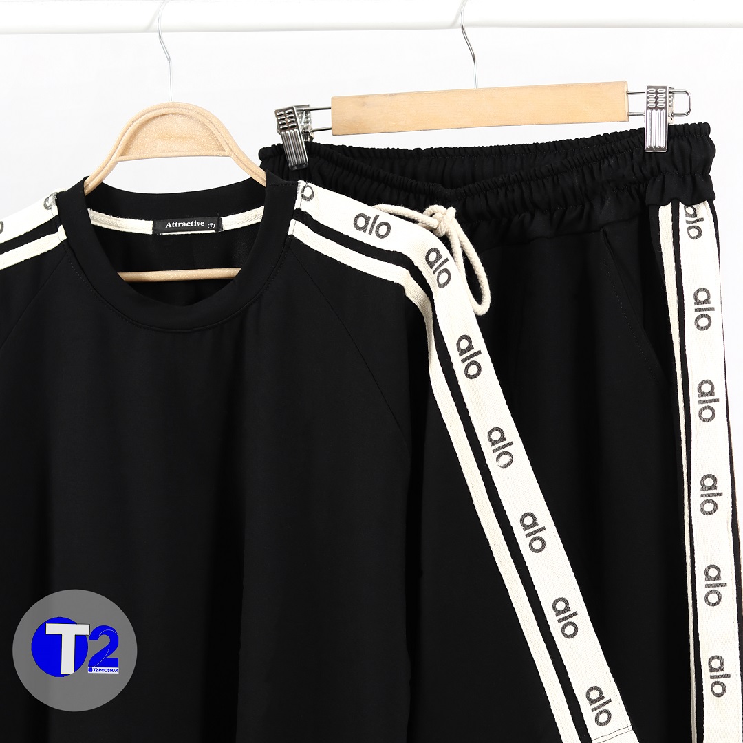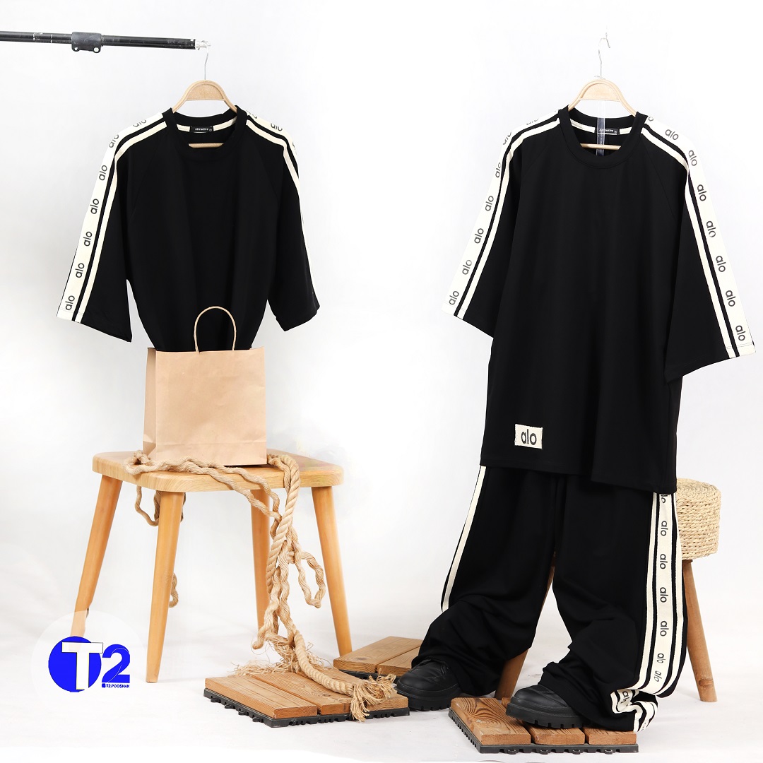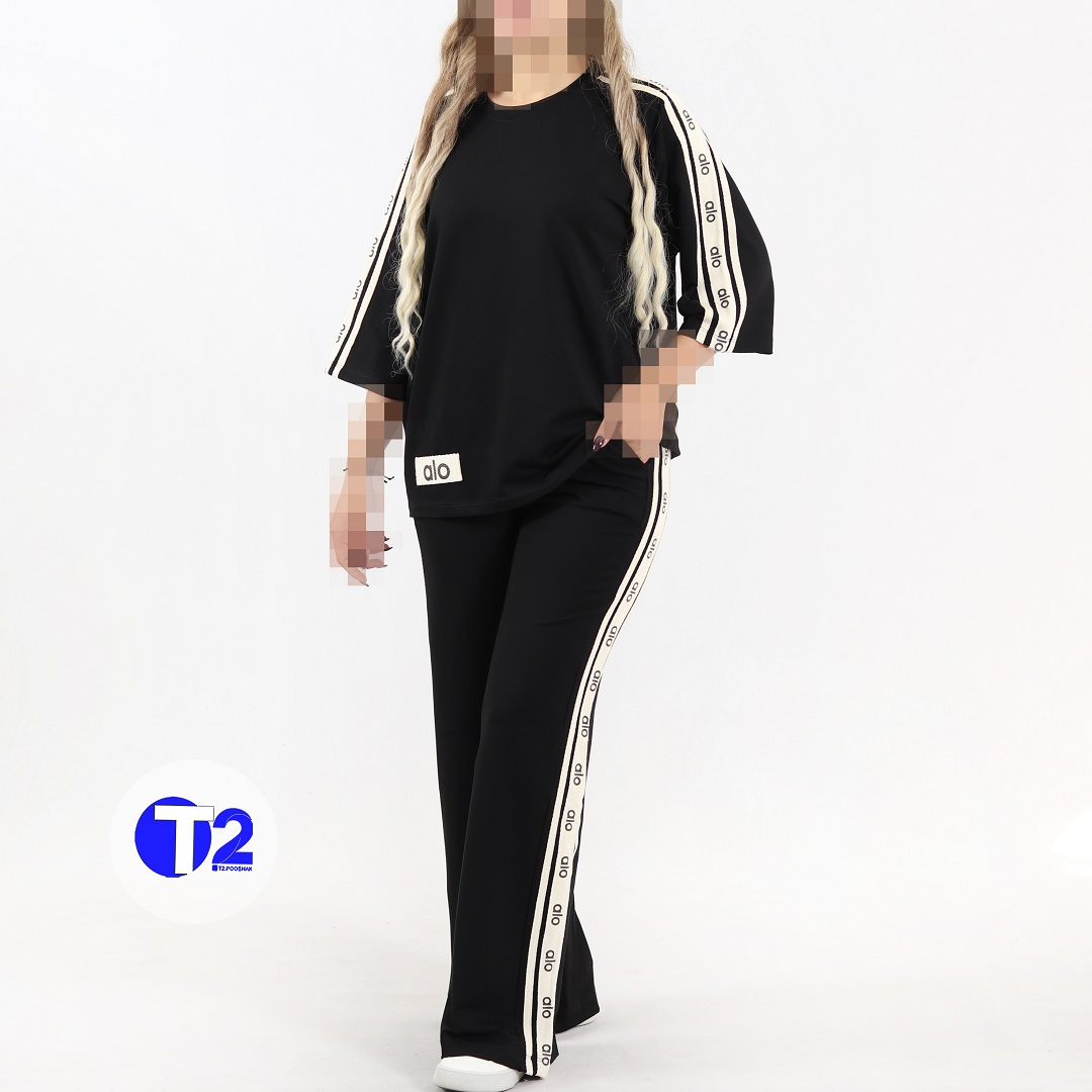 ست تیشرت باکسی وشلوار بگ پنبه گلکسی بغل نواری الو